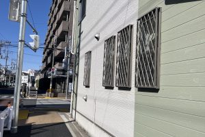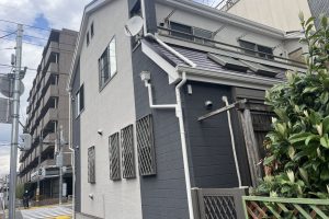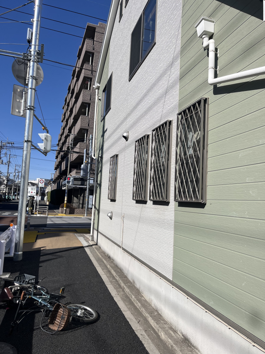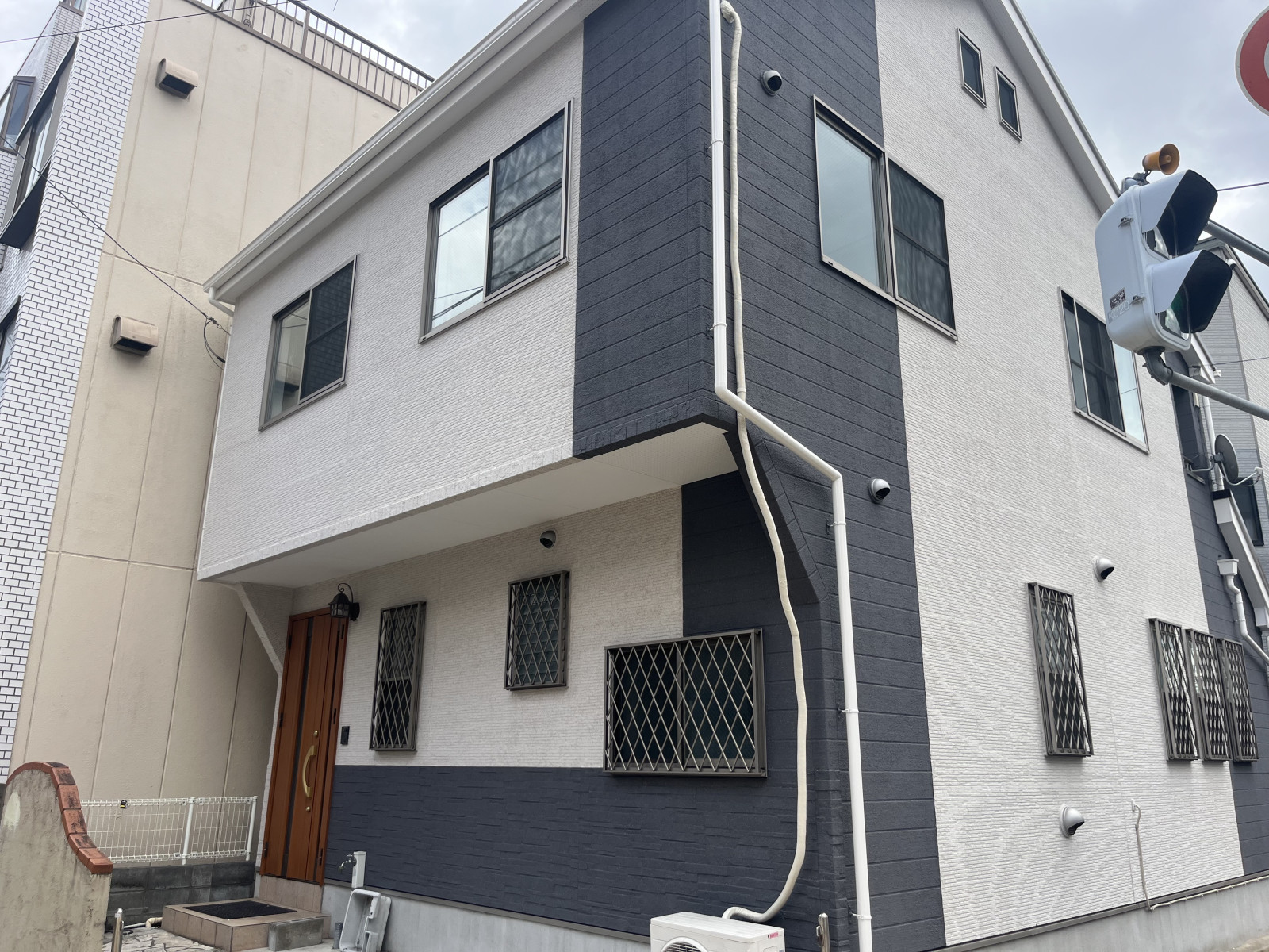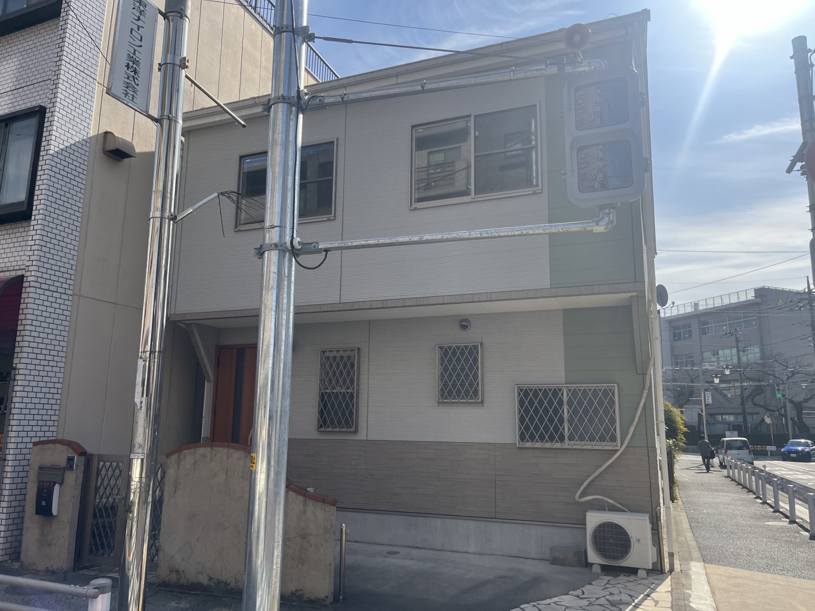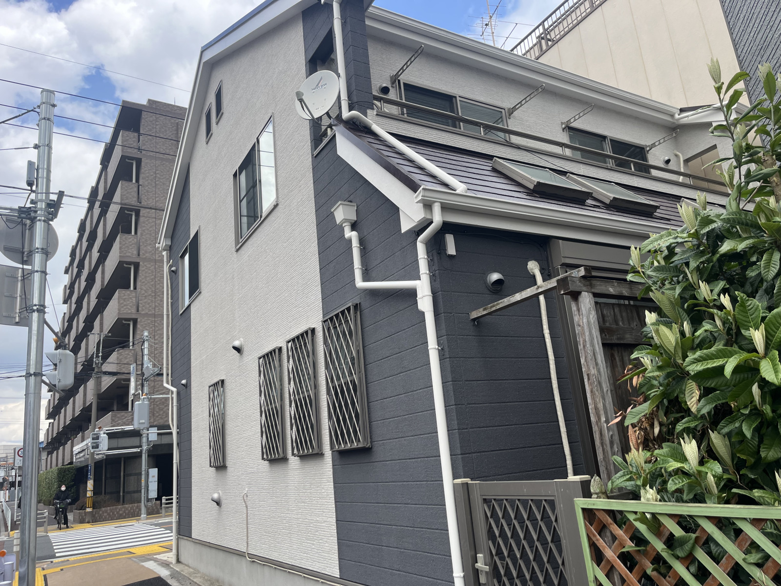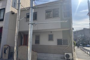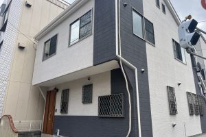 経年劣化により、外壁にチョーキング現象(白い粉の発生)が見られ、全体的に色あせた印象でした。